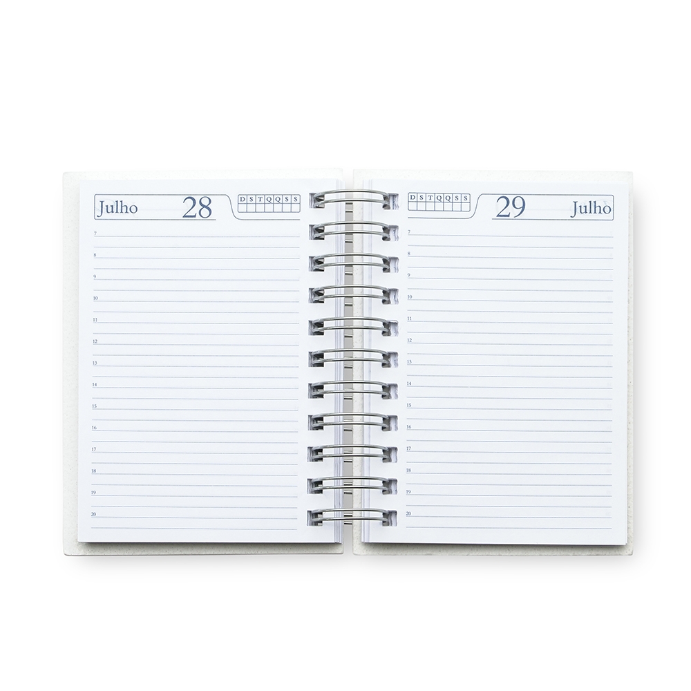 Agenda compacta permanente com capa pet sublimática e wire-o pré-fechado. Possui aproximadamente 382 páginas, folha para dados pessoais, contatos e anotações. Informações do fornecedor para sublimação: temperatura 200ºC, tempo 25/30 segundos.