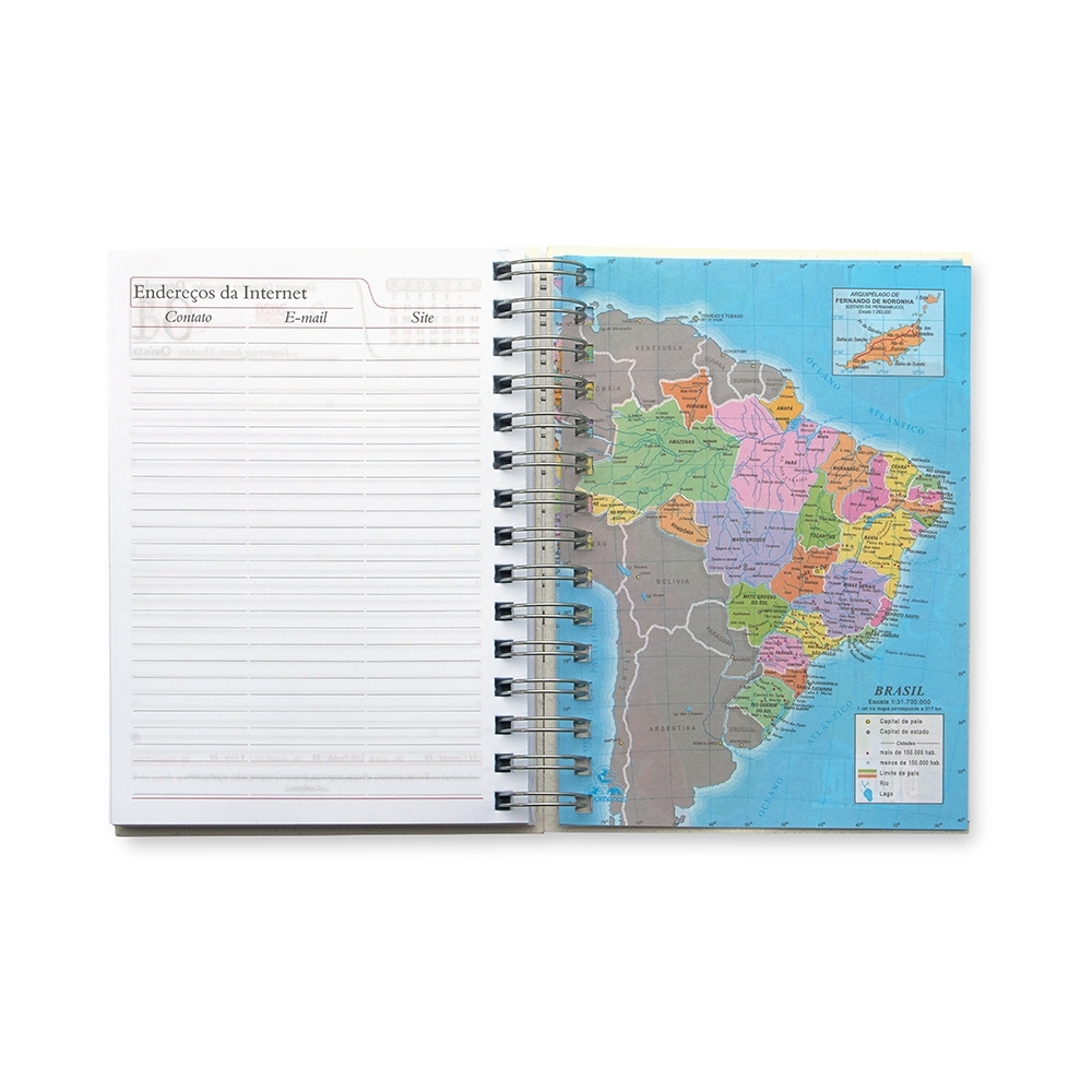 Agenda diária 2020 com capa pet sublimática e wire-o pré-fechado. Possui folha envelope plástica, dados pessoais, calendário 2019 à 2021, endereços da internet, mapa Brasil, mapa Mundi, índice telefônico e planejamento. Informações do fornecedor para sublimação: temperatura 200ºC, tempo 25/30 segundos.