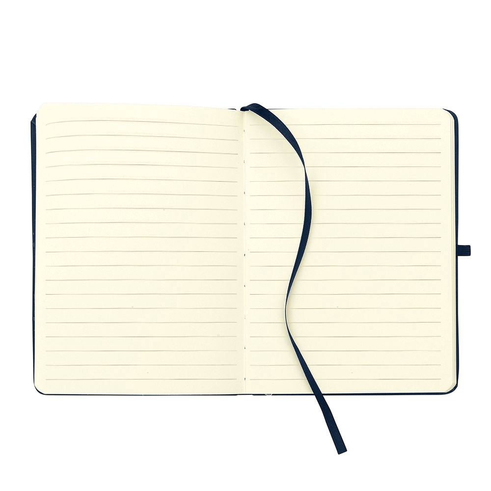 Caderneta tipo moleskine emborrachado com porta caneta em nylon, marcador de página em cetim e fita elástica para lacre. Contém aproximadamente 80 folhas pardas com pauta.