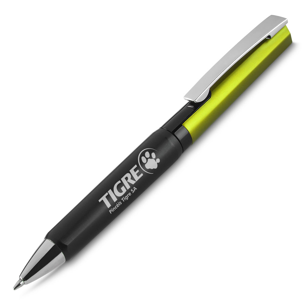 Caneta plástica com clip metálico twist escrita em azul
