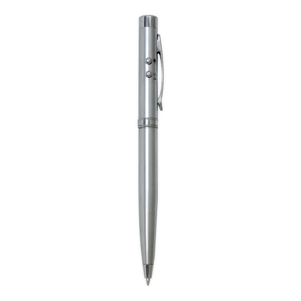Caneta metal com laser e lanterna em estojo metálico. Caneta possui desenhos indicativos ao lado dos botões, para acionar a esferográfica basta girar o corpo da caneta. Acompanha três baterias LR41.