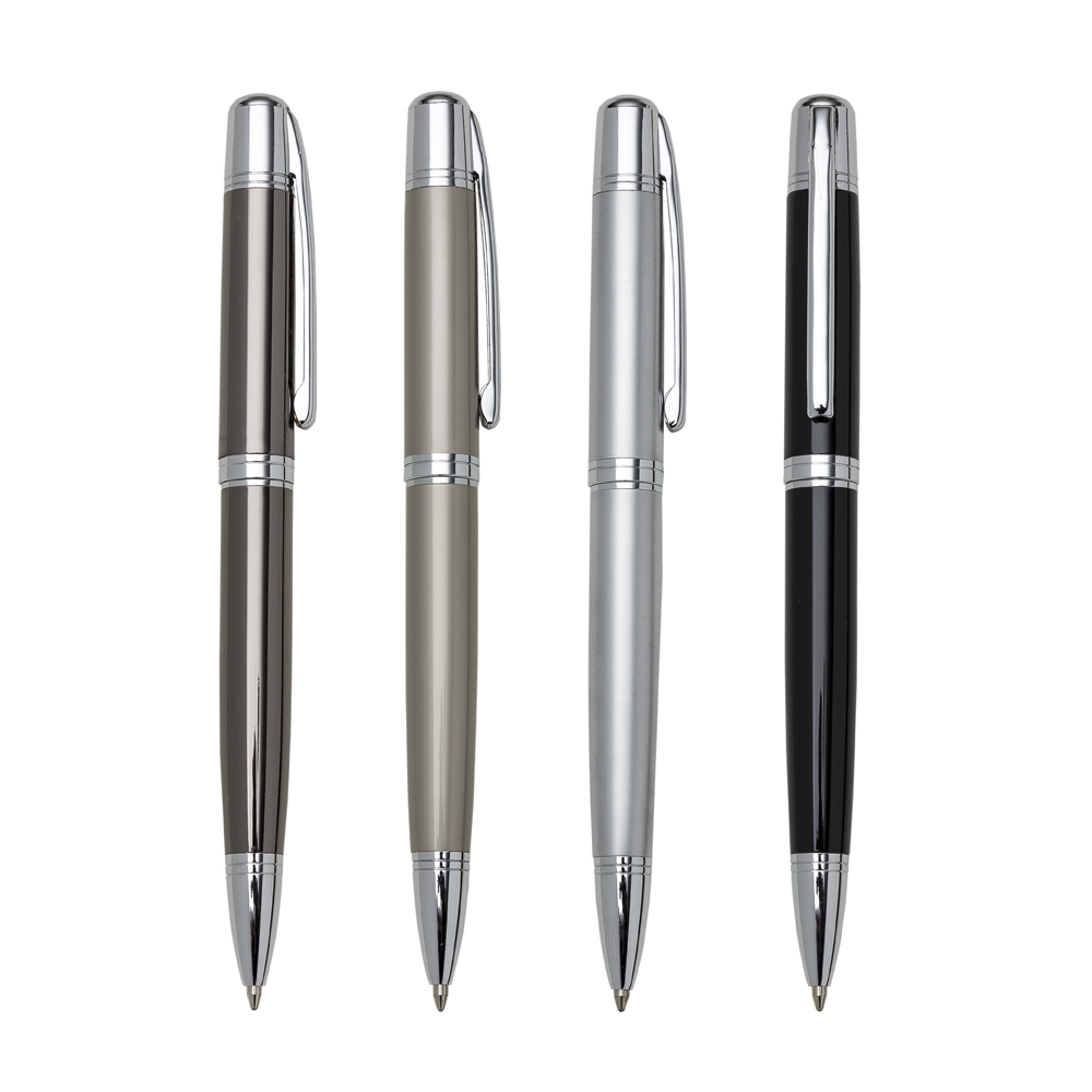 Caneta metal inteira colorida com detalhes prata. Clip metal com dois anéis em relevo, anel centralizado e dois anéis em relevo na ponteira. Aciona por giro.