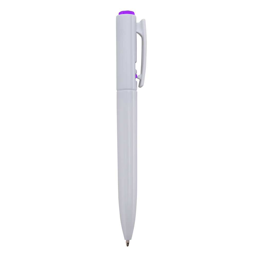 Caneta plástica branca com detalhes coloridos e anel central em relevo. Aciona por clique e para destravar basta apertar a parte inferior do clip.