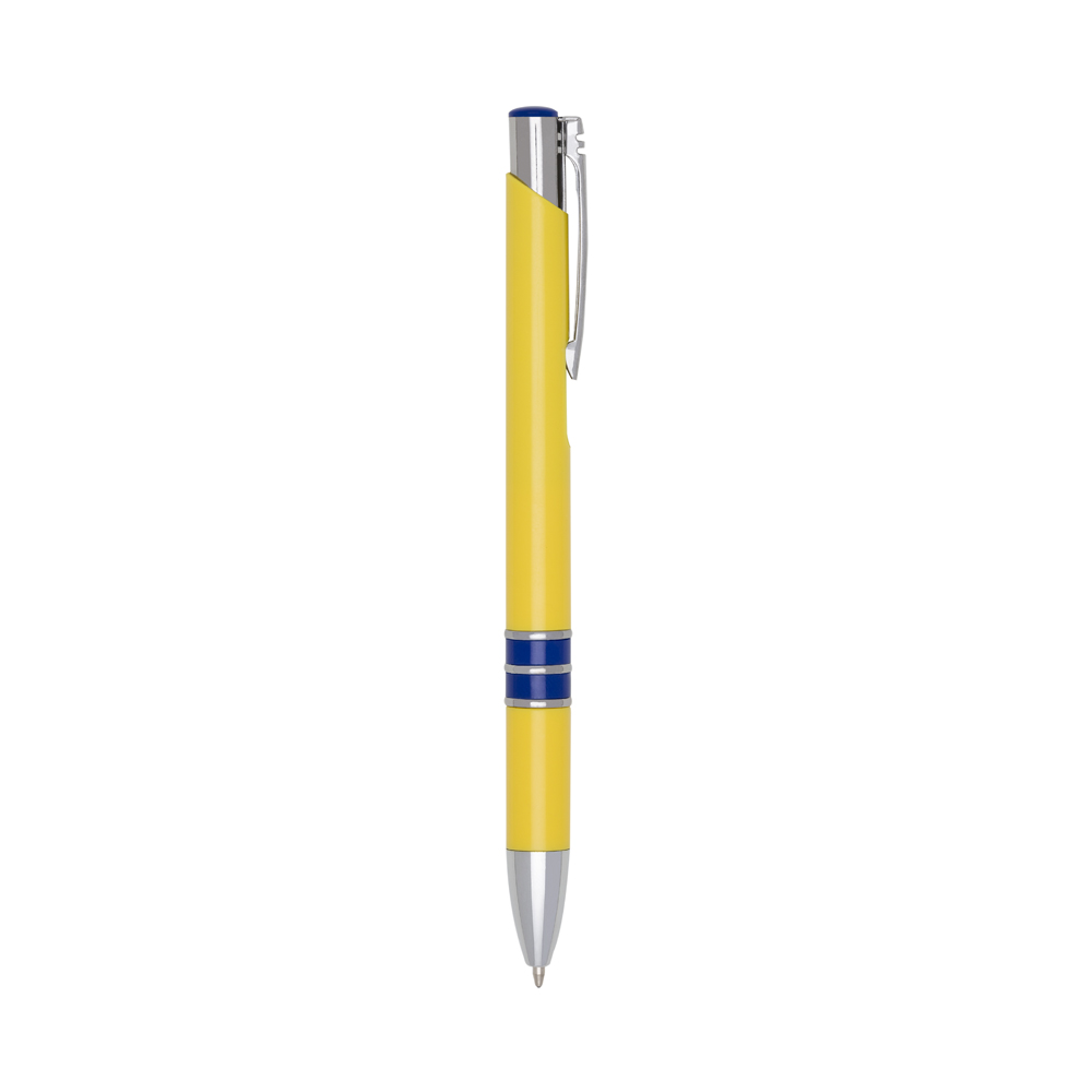 Caneta plástica amarela com detalhes coloridos. Ponta do acionador colorido e clip metal, possui 3 anéis inferiores e detalhes em prata. Aciona por clique.