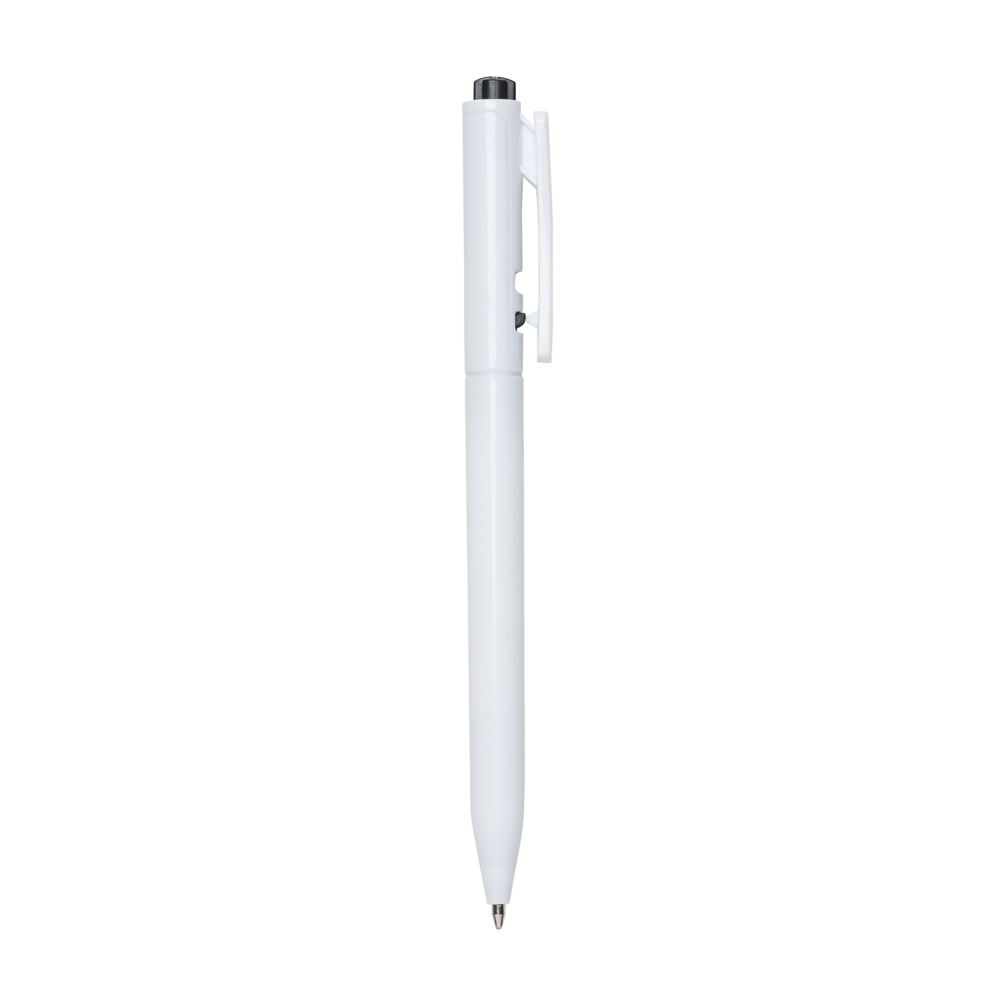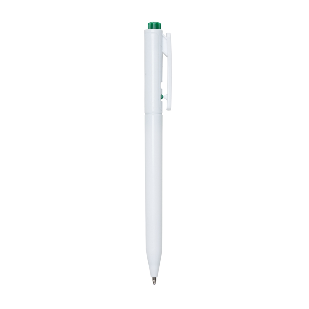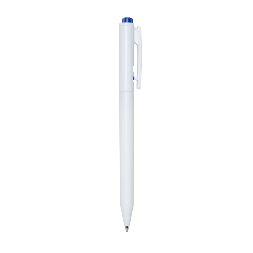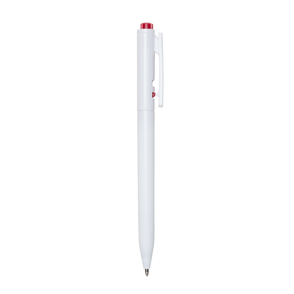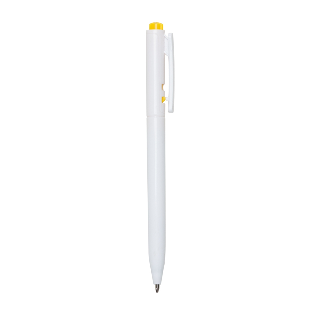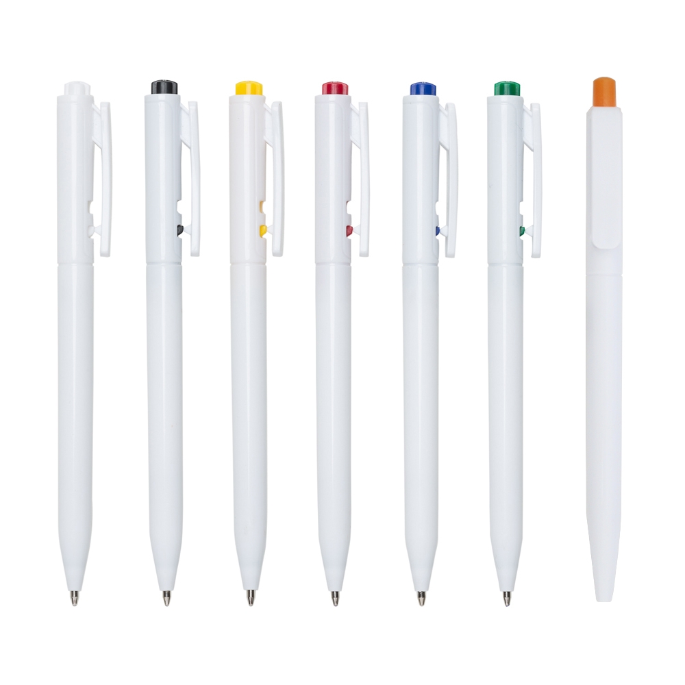 Caneta plástica leitosa com detalhe colorido. Acionador com detalhes em relevo e clip plástico, aciona por clique e para destravar basta apertar a parte inferior do clip.