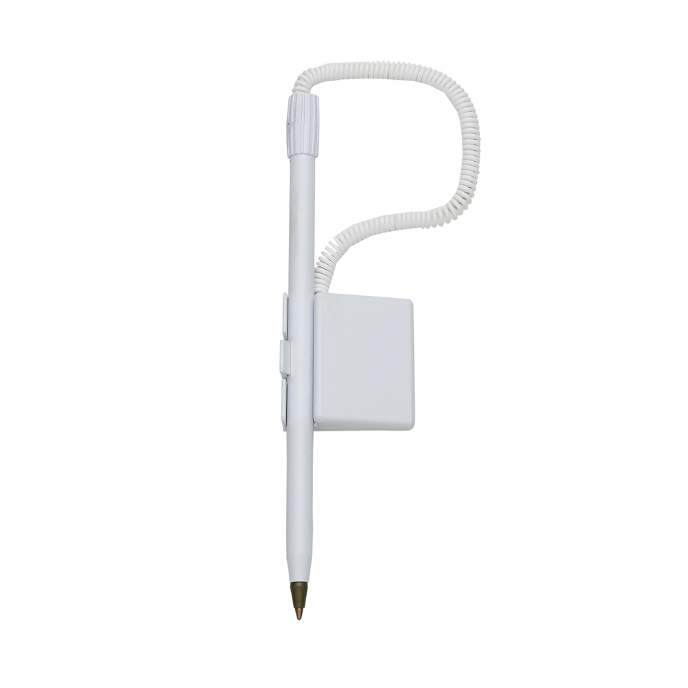 Caneta balcão plástica inteira branca com detalhe colorido. Acionador com relevo, possui traseira com adesivo auto-colante. QUANTIDADE MÍNIMA DE 100 PEÇAS!