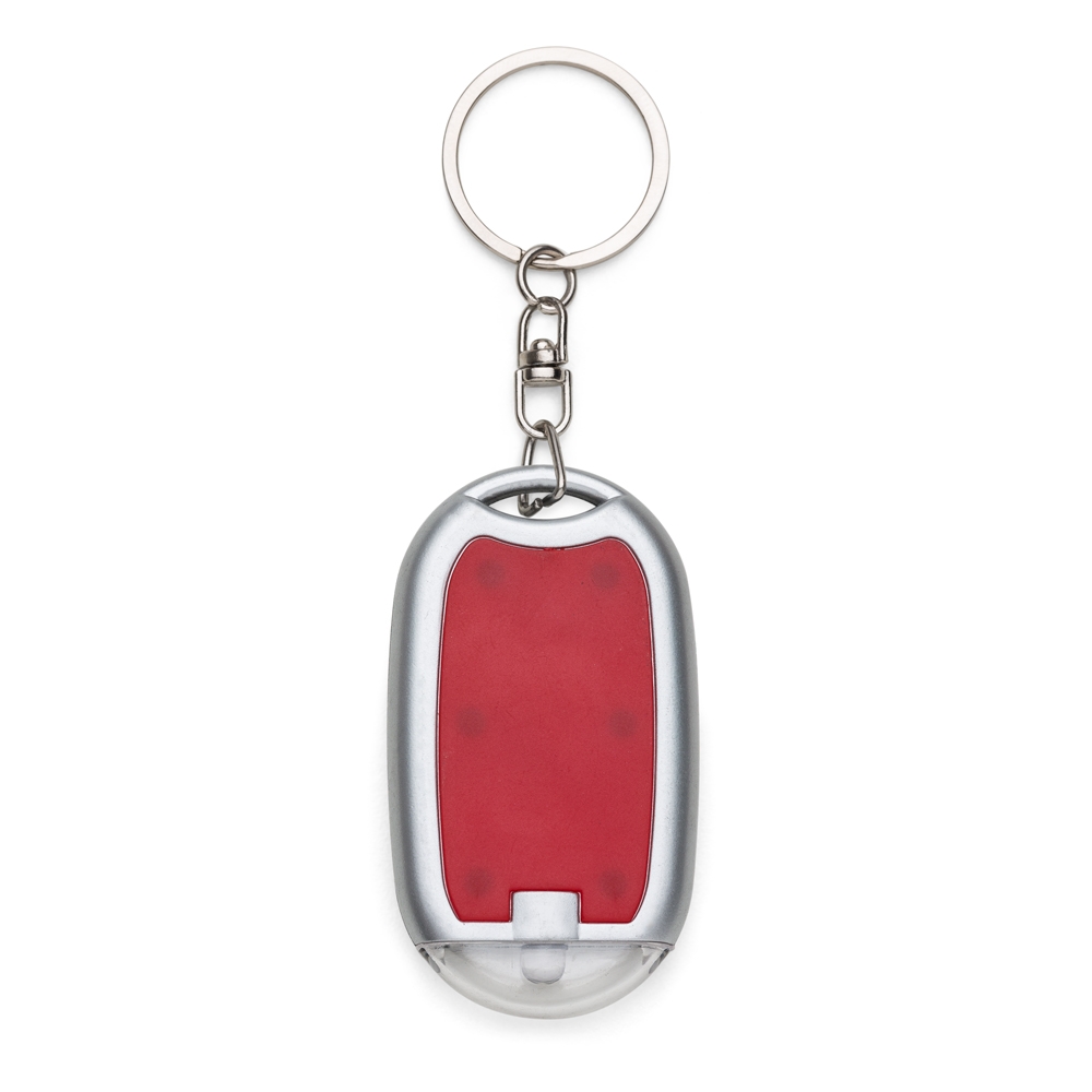 Chaveiro lanterna plástico, parte central colorida lisa e verso com botão para acionar lanterna. Possui as laterais em prata e lanterna com proteção acrílica, acompanha 3 baterias(duas LR1130 e uma CNB G10).