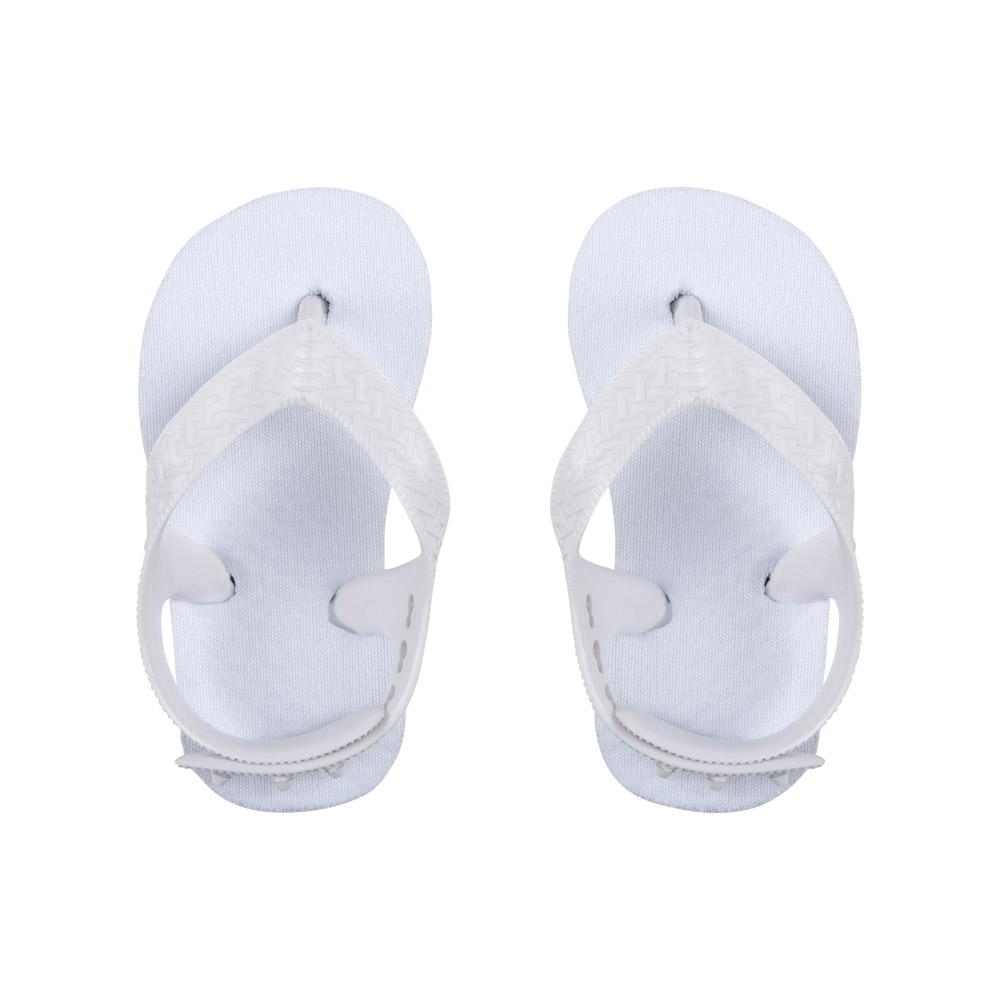Chinelo numeração 19/20 de borracha(80%) e EVA(20%) com tecido para sublimação, possui tira ajustável na parte traseira. PEDIDO MÍNIMO DE 350 PEÇAS!