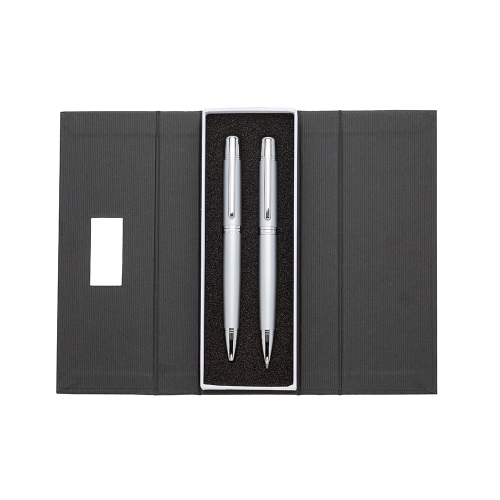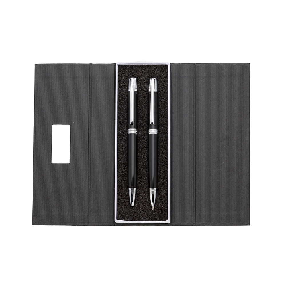 Conjunto caneta e lapiseira em estojo de cartonagem com placa central para personalização. Clip metal com dois anéis em relevo, anel centralizado e dois anéis em relevo na ponteira e acionam por giro. Estojo revestida com espuma na parte interna.