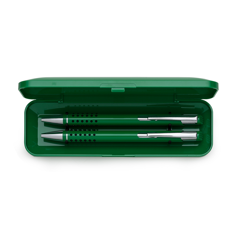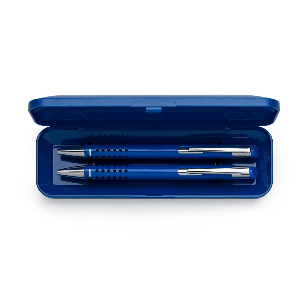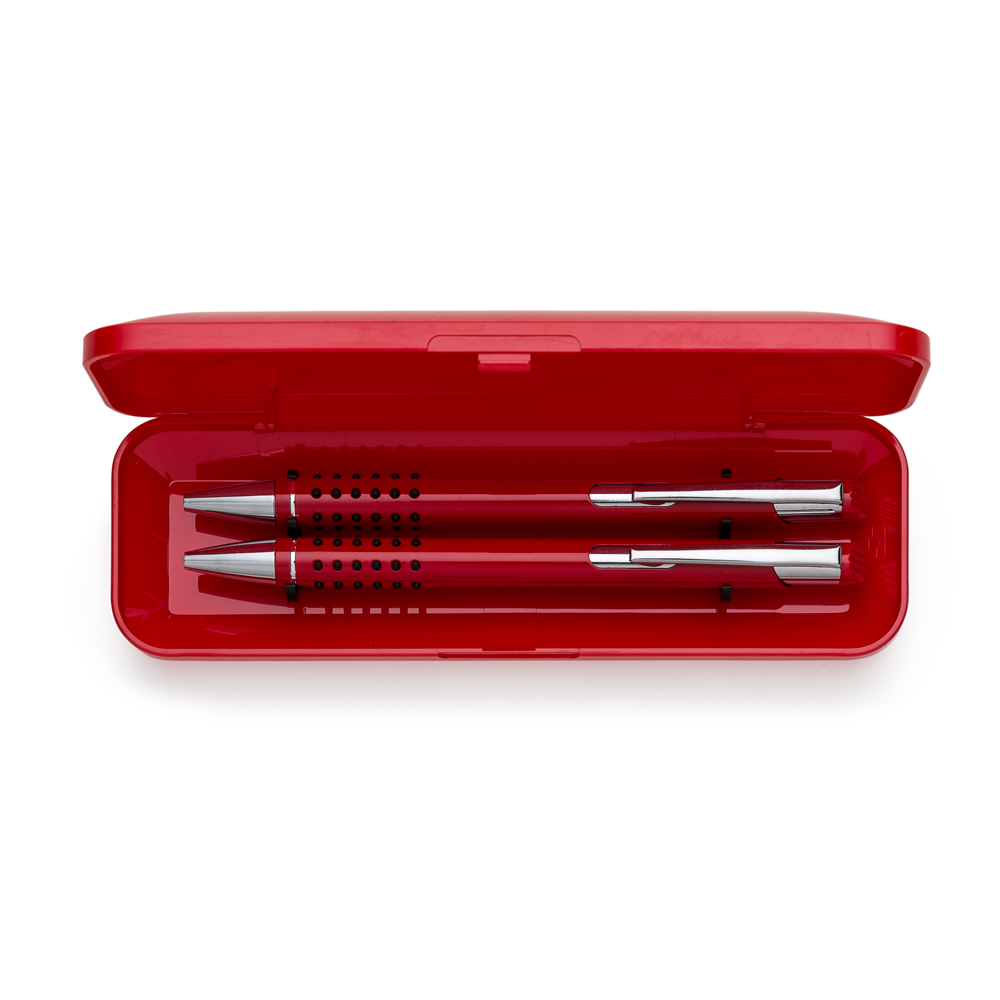 Conjunto caneta e lapiseira semi-metal e estojo plástico resistente. Estojo não é plano(apenas a parte central), caneta e lapiseira semi-metálicas inteiras coloridas com detalhes prata(acionadas por clique), clip de metal e parte inferior com 36 “bolinhas” pretas emborrachadas( possui anel na parte inferior). OBS.: PEDIDO APENAS MÚLTIPLO DE 50 PEÇAS!