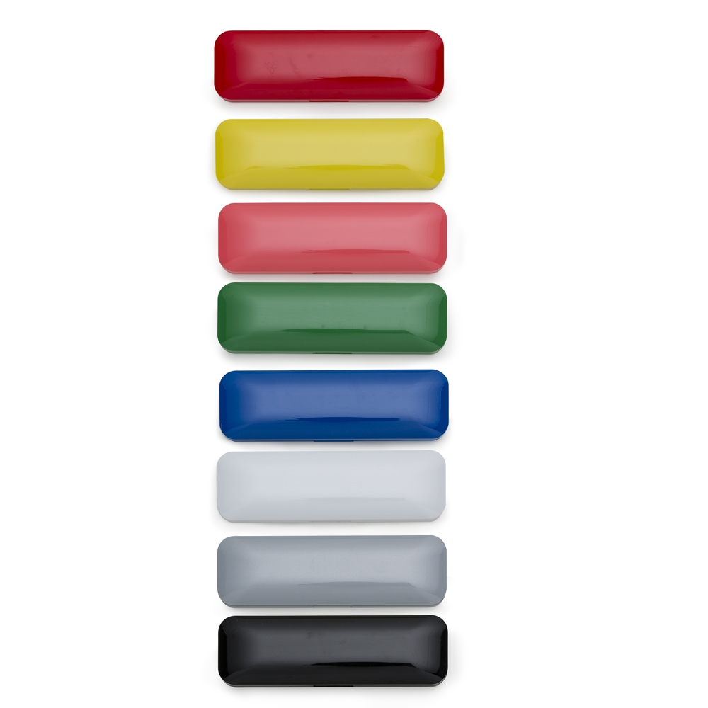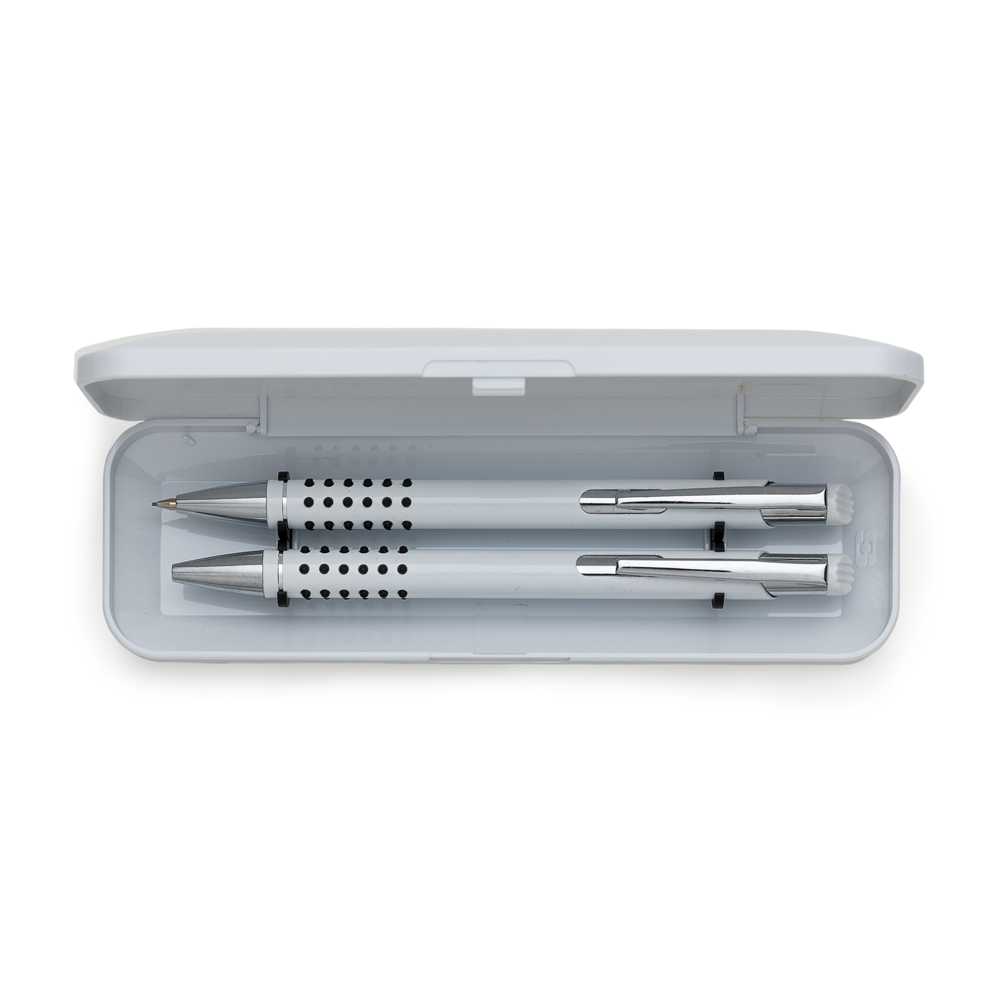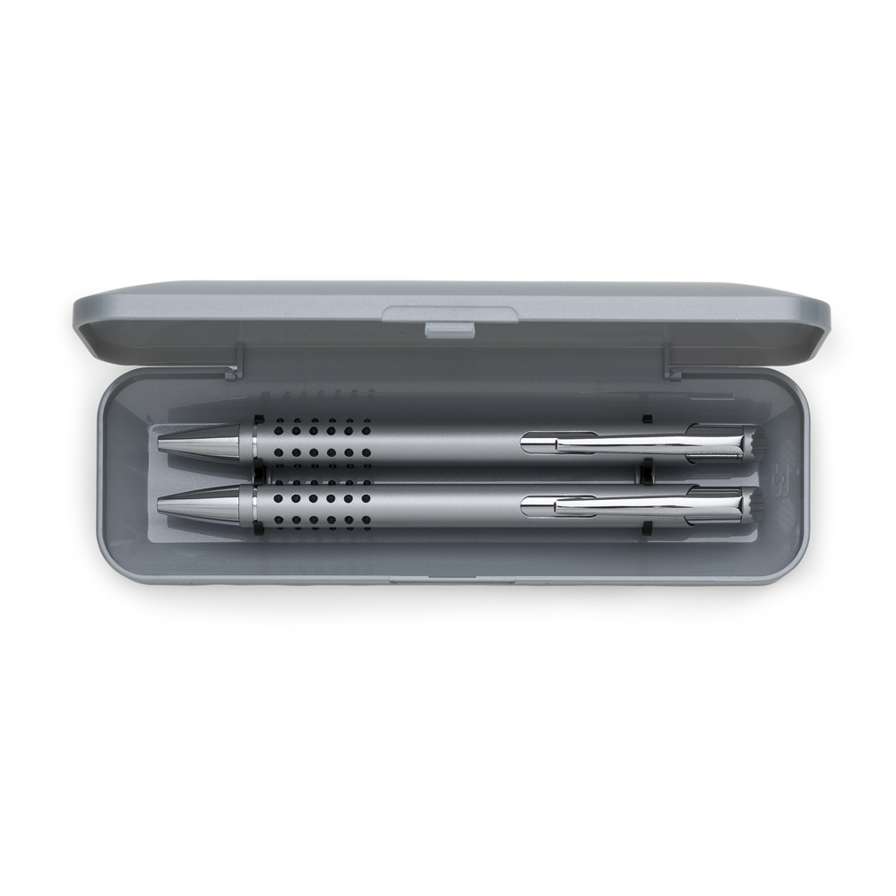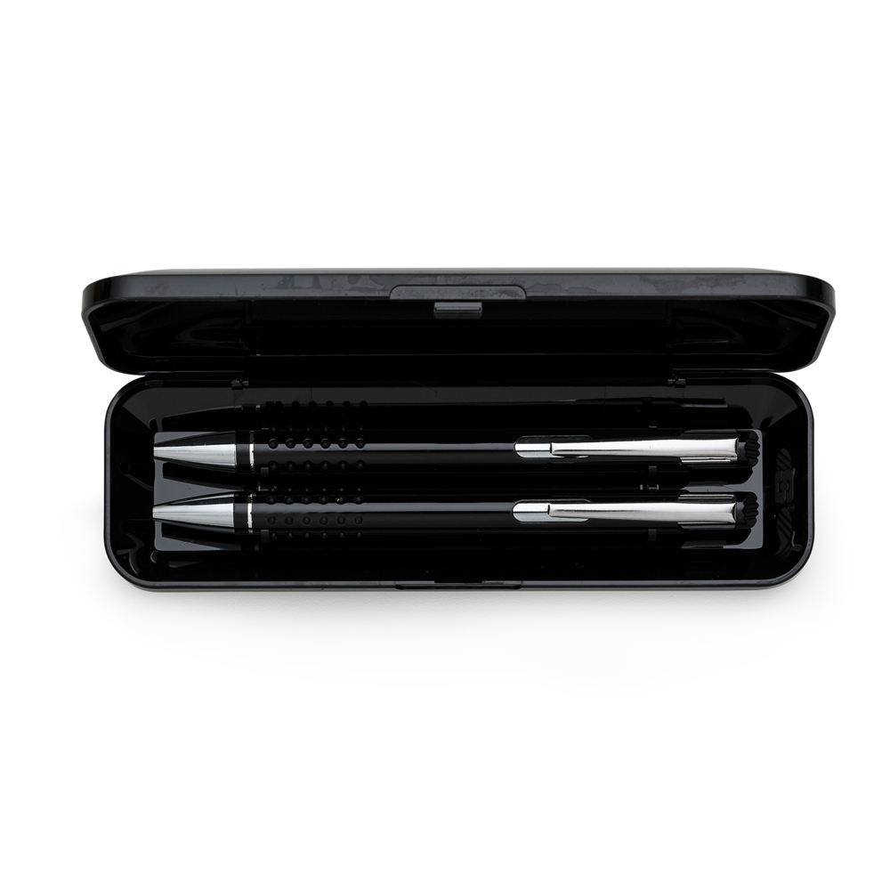 Conjunto caneta e lapiseira semi-metal e estojo plástico resistente. Estojo não é plano(apenas a parte central), caneta e lapiseira semi-metálicas inteiras coloridas com detalhes prata(acionadas por clique), clip de metal e parte inferior com 36 “bolinhas” pretas emborrachadas( possui anel na parte inferior). OBS.: PEDIDO APENAS MÚLTIPLO DE 50 PEÇAS!