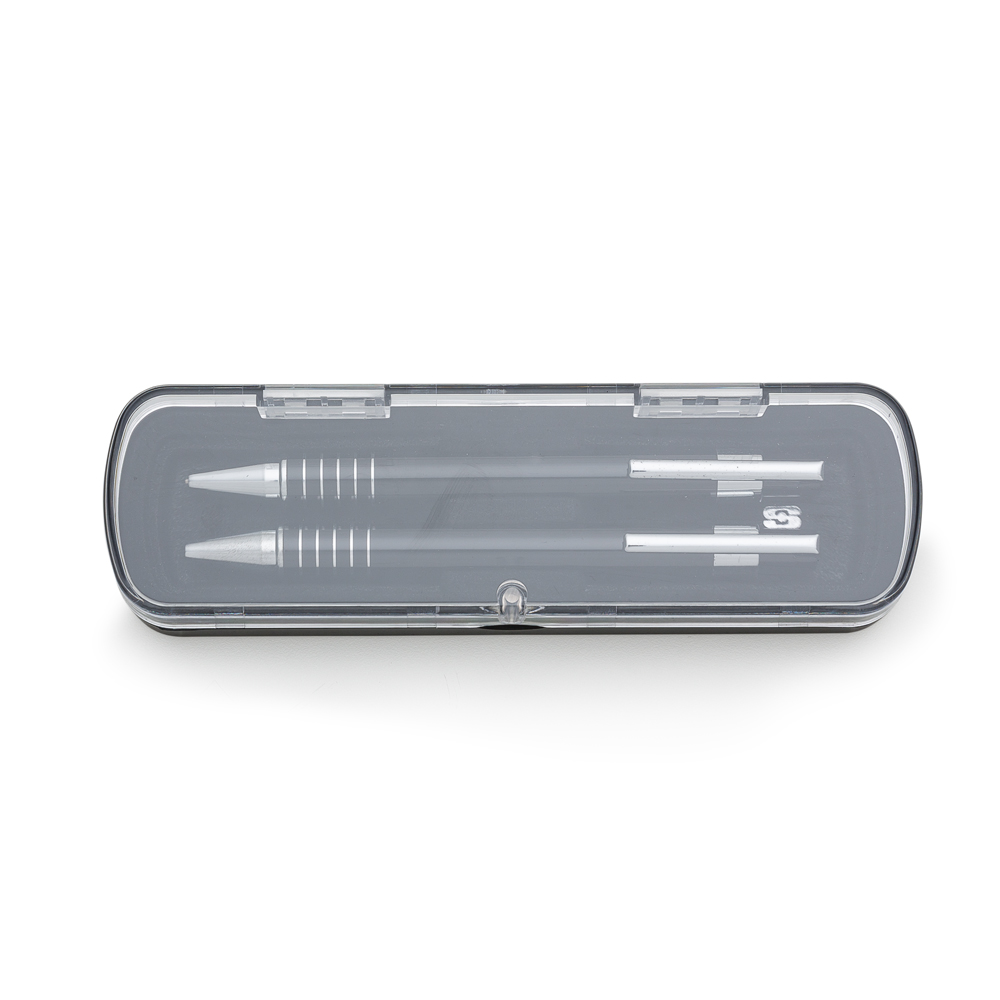 Caneta e Lapiseira semi metal em estojo de acrílico com detalhe plástico. Caneta e lapiseira com clip de metal, suporte do acionador com anel plástico e cinco anéis prata na parte inferior, acionam por clique. Estojo revestido de veludo interno e com suporte/encaixe para fixar as peças dentro, estojo de imã. OBS.: PEDIDO APENAS MÚLTIPLO DE 50 PEÇAS!