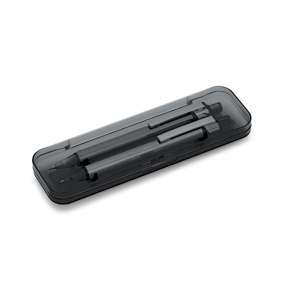 Conjunto de esferográfica e lapiseira. Alumínio. Esferográfica: 1,5km de escrita. Lapiseira: grafite 0.5. Incluso estojo.
