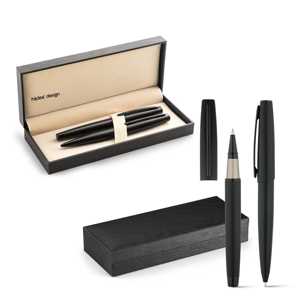 Conjunto de roller e esferográfica. Metal. Esferográfica: 1,5km escrita. Em estojo almofadado.