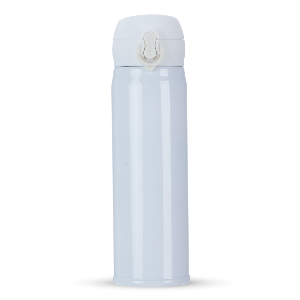 Garrafa térmica de 400ml de metal colorida com botão e válvula para abertura. Possui um sistema de trava (basta mover para cima/baixo para abrir/fechar), pressione o botão central para abrir a tampa(possui na parte interna borracha protetora evitando vazar o líquido). Para abrir a tampa por completo basta rosqueá-la, parte interna revestida em inox. Na embalagem do produto pode ir especificado a capacidade de 450ml ou 500ml devido aos fabricantes que trabalham terem impresso a descrição deste modo, porém ressalvamos a capacidade correta de 400ml.