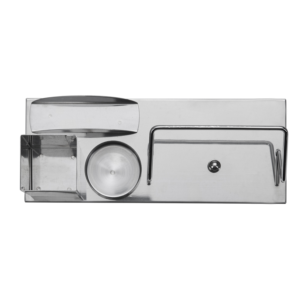 Kit escritório 4 em 1. Material inox espelhado, suporte para cartões, canetas, clips e celular.