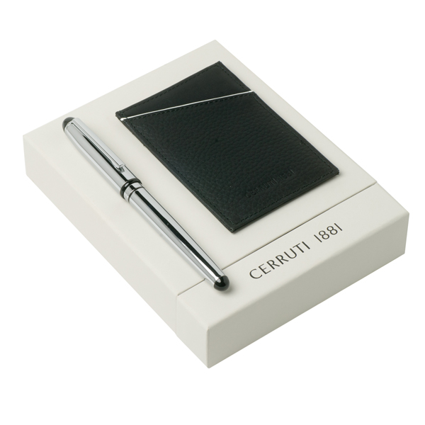 Kit porta cartões e roller. Porta cartões em couro, com capacidade para 3 cartões. Roller em metal. Fornecido em caixa de oferta.