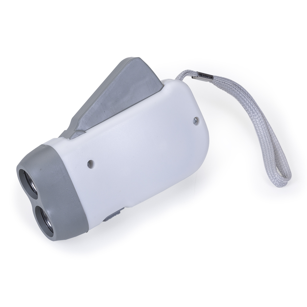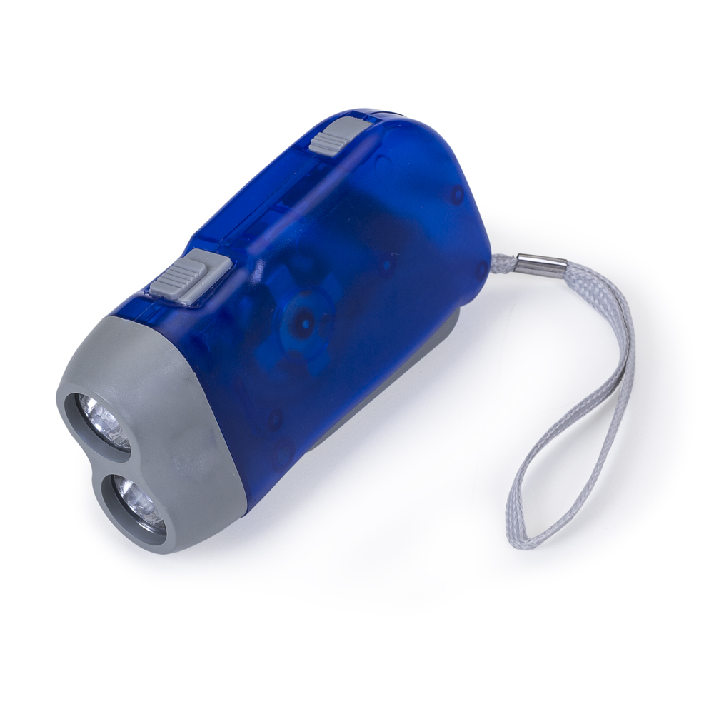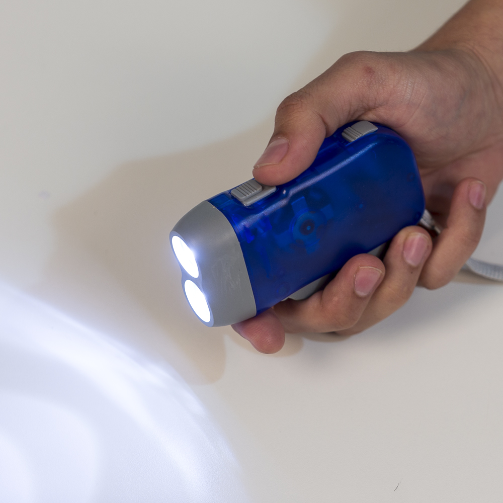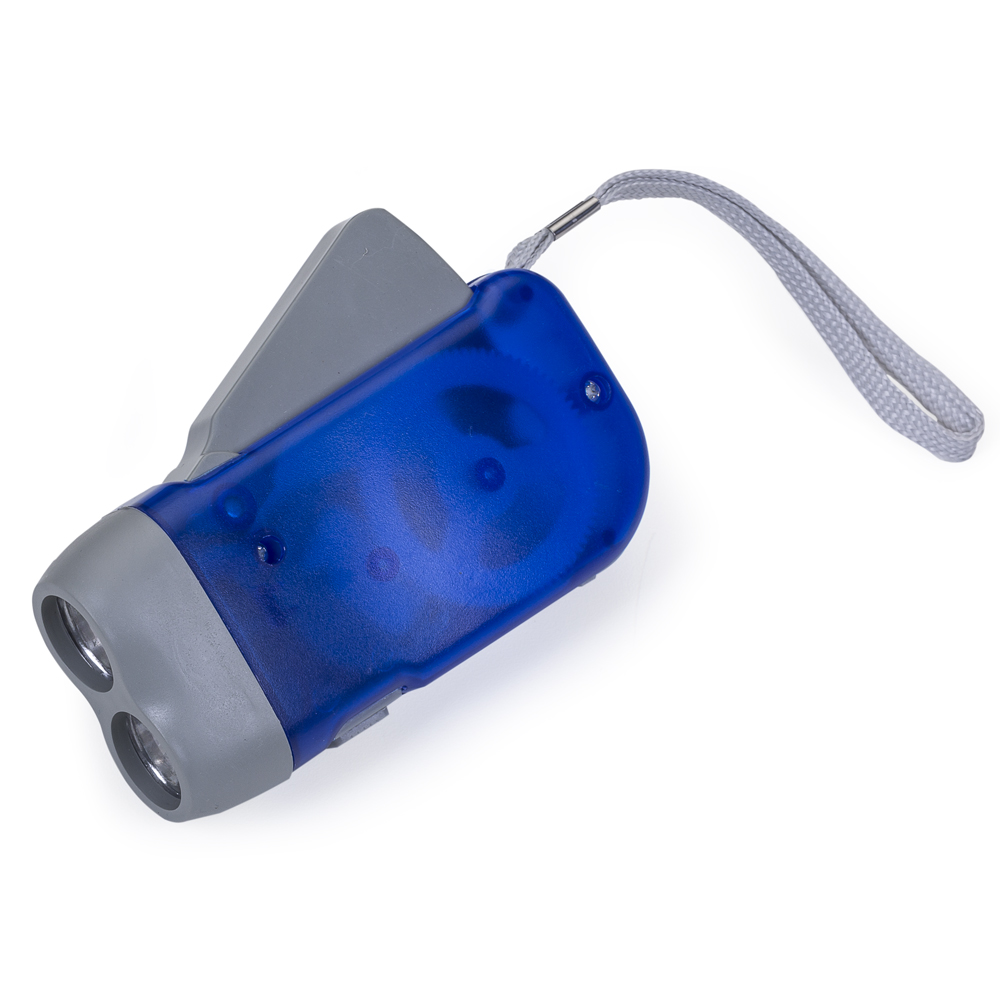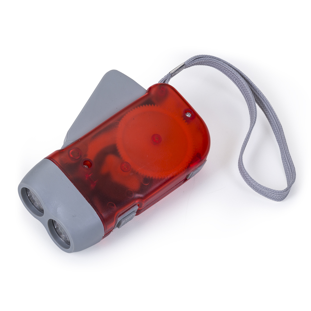 Lanterna plástica com 2 leds, pressionando o “gatilho” gera energia para alimentar a lanterna dínamo. Possui botão para ligar/desligar lanterna, botão para travar gatilho e acompanha cordão.