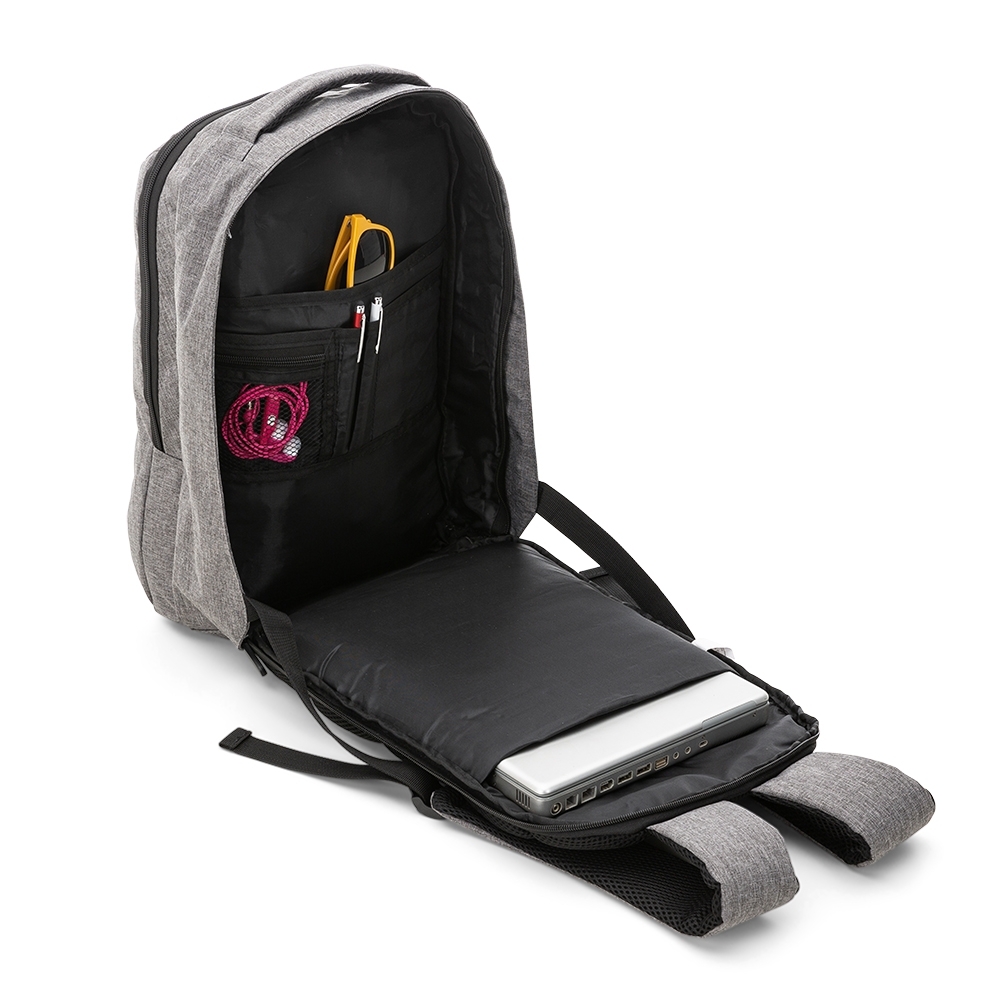 Mochila de nylon com compartimento para notebook. Compartimento principal localizado na traseira da mochila que contém: compartimento para notebook, divisórias para documentos e canetas e um pequeno um bolso de malha com zíper; possui zíperes com pegadores plásticos, compartimento superior com amplo espaço e bolso com abertura lateral na área frontal. Área traseira com revestimento espumado para melhor conforto e também auxiliar na circulação de ar, alça de mão e alças para costa ajustáveis também com revestimento.