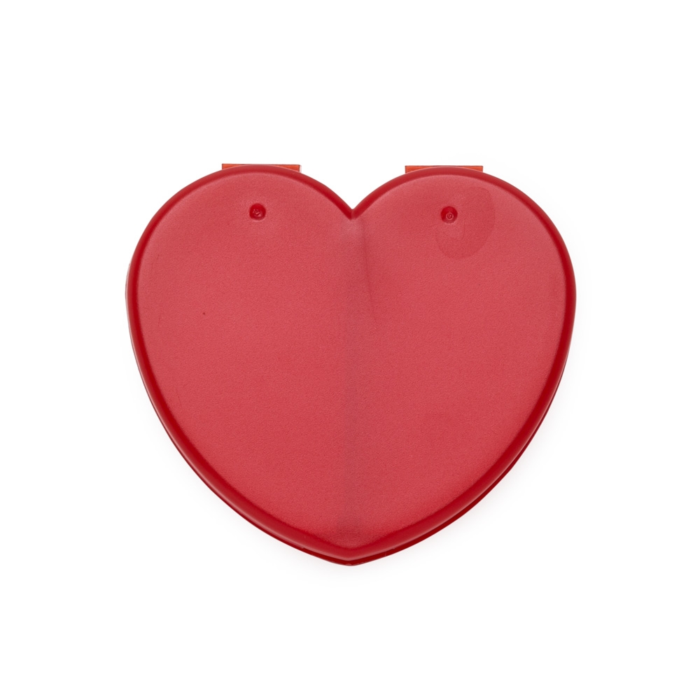 Porta comprido plástico de formato coração. Material plástico vermelho de pintura fosca, possui duas divisórias na parte interna.