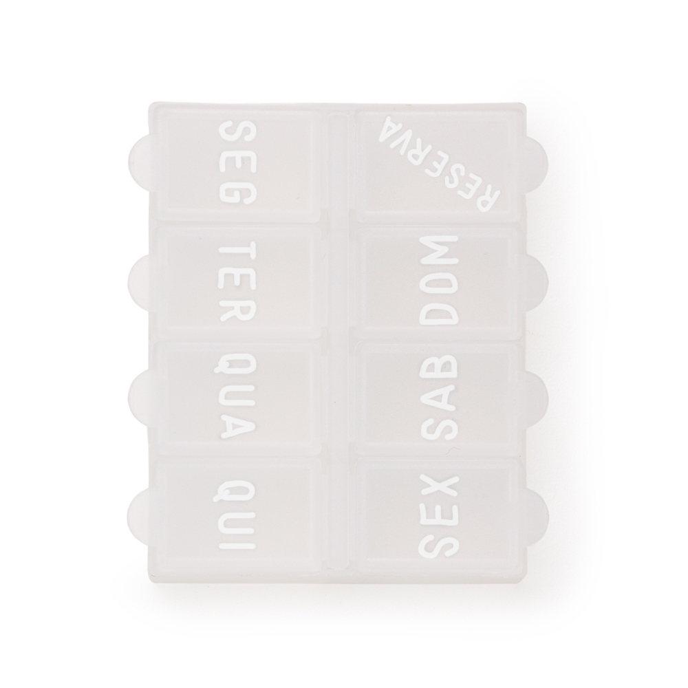 Porta comprimidos semanal de plástico branco fosco. Possui oito divisórias, sete delas escrito em relevo os dias da semana e a última escrito "reserva". Verso liso.