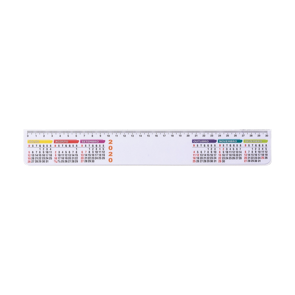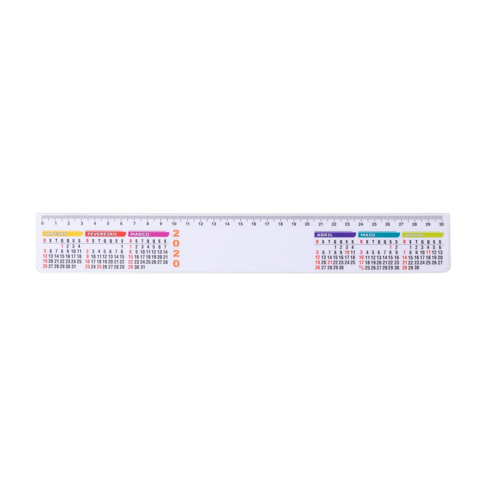 Régua plástica de 30cm com calendário. Impressa em papel offset e encapsulada em plástico rígido, sem contorno na grade de meses. QUANTIDADE MÍNIMA DE 100 PEÇAS!